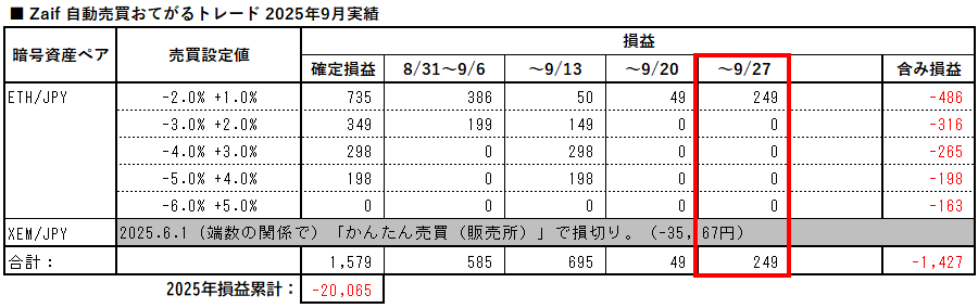 Zaifおてがるトレード、2025年9月21日~9月27日の実績です。