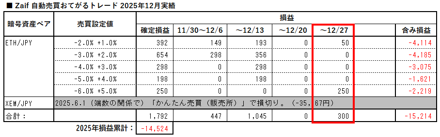 Zaifおてがるトレード、2025年12月21日~12月27日の実績です。