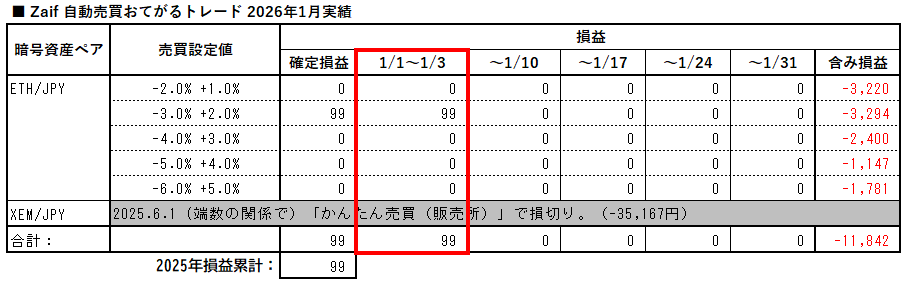 Zaifおてがるトレード、2026年1月1日~1月3日の実績です。