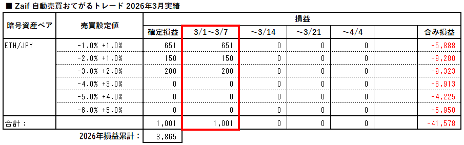 Zaifおてがるトレード、2026年3月1日~3月7日の実績です。