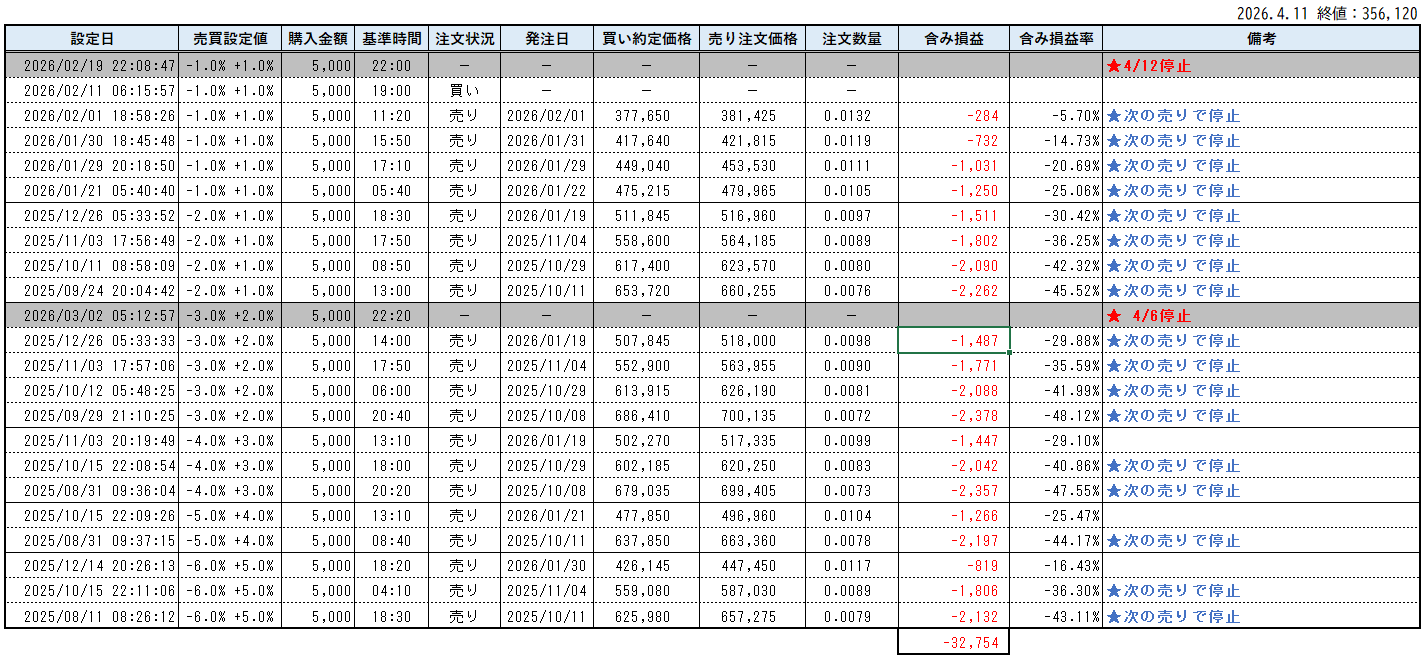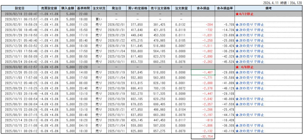 私自身は、資金的に余裕がないので、有名な方たちがやっているような積み立てでは運用していません。設定が塩漬け状態にになったと思われた時点で設定を追加しています。また、塩漬けが解消した時点で同じ設定が重複して出て行ってしまうのを防ぐために、設定を追加した時点で塩漬けの設定は「次の売りで停止」にします。